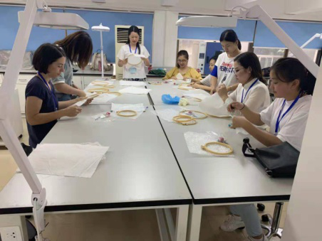 纺织品保护修复组的学员们经孙丽娟老师的讲解与示范,学会了部分中国传统刺绣针法与染色技术,完成了团扇刺绣小品制作以及扎染、蜡染作品创作。在陕西省考古研究院路智勇老师的指导下,进行了纺织品文物除尘、清洗与平整等保护修复操作的实践。