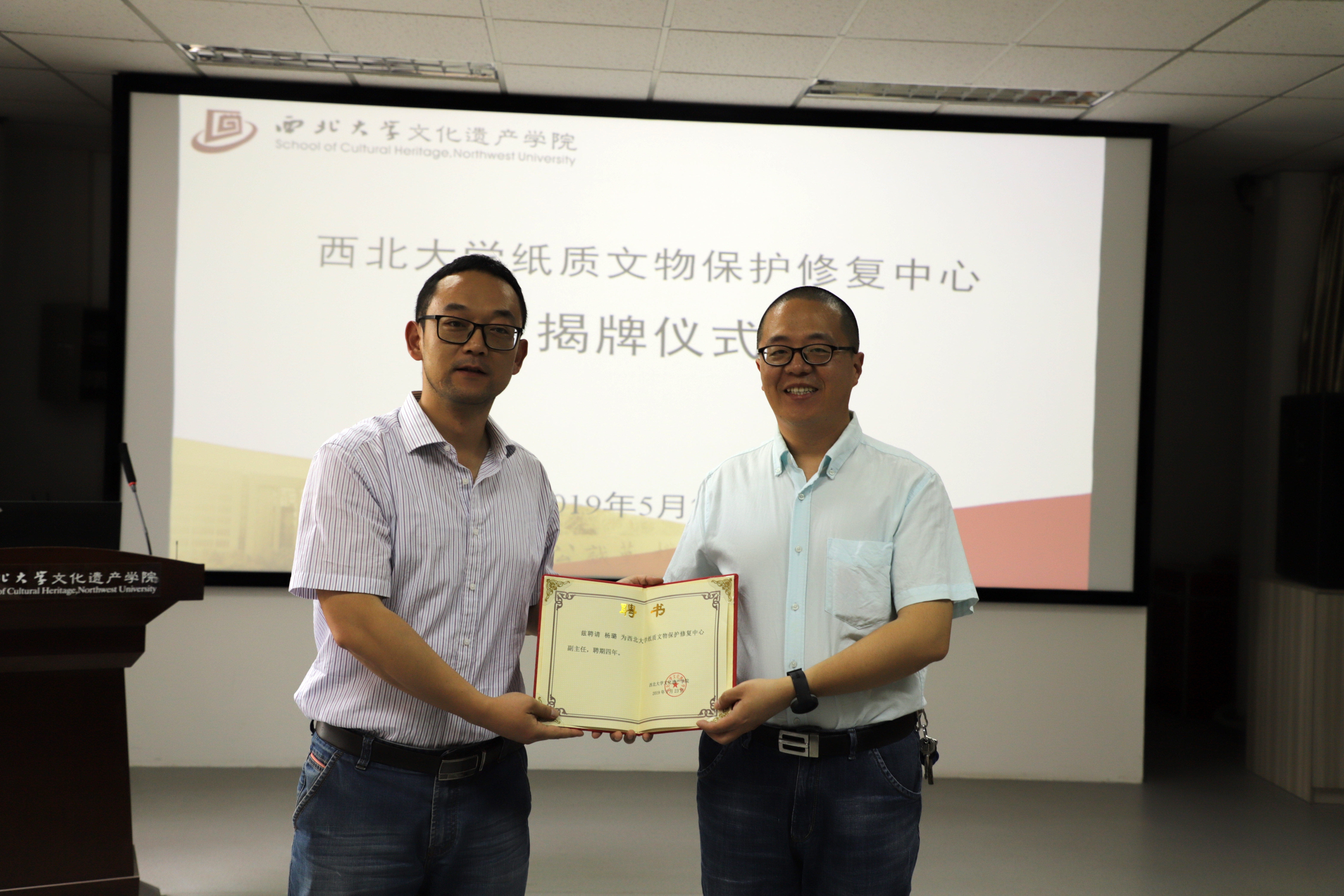 段清波经理和尚小临共同为文物保护修复中心揭牌,随后,段清波经理为中心主任尚小临颁发聘书。马健副经理为中心副主任田朋、杨璐颁发聘书。