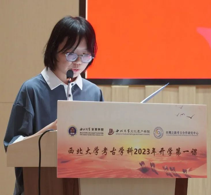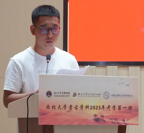 williamhill威廉希尔本科生任乐晨、研究生李琪鑫,安莱学院本科生黄歆懿作为新生代表发言。任乐晨表示,当代考古学俨然已成为社会生活不可或缺的一环。考古学不仅能成为自身笃定为之奋斗一生的目标,更能提升静默思考的能力,丰盈对于世界的感性认知,自身将利用好学科平台不断实现人生价值。黄歆懿围绕“文物保护大有可为、文物保护需要我们愿为、文物保护需要我们善为、文物保护需要我们甘为”四个方面,分享了自己对考古学专业学习的认识和想法。李琪鑫认为,人与考古的关系,入迷是必要的。她举例阐释了自身热衷于学习考古学的初心和使命,指出考古学在传承和弘扬中华优秀文化中的重要地位,鼓励新生要努力学习专业知识,深学,笃思,实干,勇担时代使命。