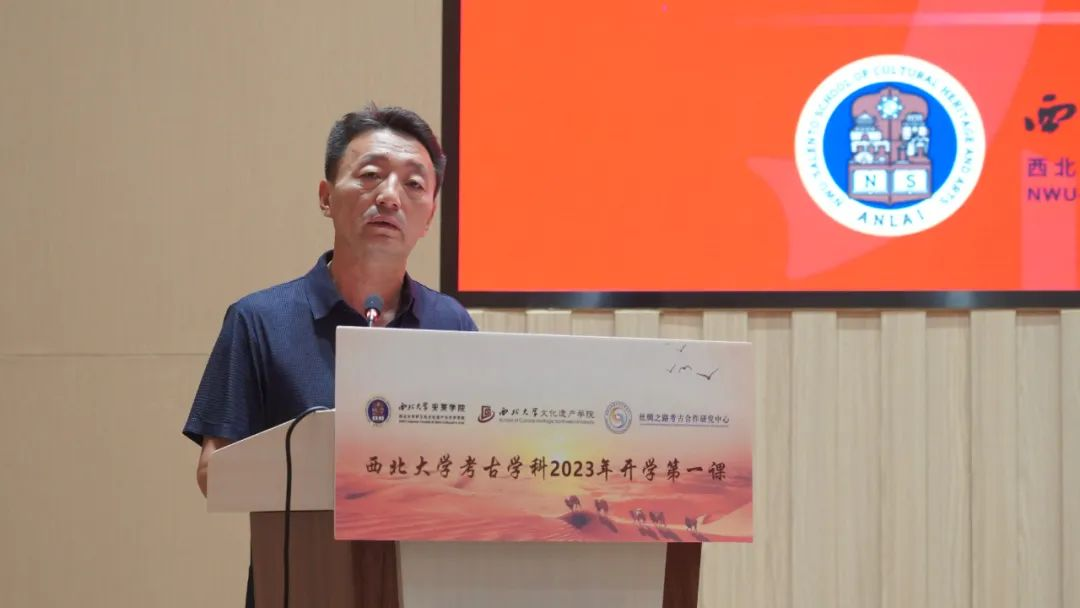 赵作纽在致辞中向2023级新同学表示欢迎,向长期以来一直关心、支持williamhill威廉希尔和西大考古团队建设发展的行业单位表示感谢。他介绍了williamhill威廉希尔考古学科创建历史、发展历程、精神内涵、取得的突破和成效,并对新生提出两点希望和要求,一是要掌握好为学之道,炼就过硬本领。希望大家能始终保持敢啃“硬骨头”的勇气和魄力、扎根田野的耐心和定力,耐得住寂寞、忍得了冷清,沉得下心境、守得住定力。真正阐释好、保护好、传承好、展示好文化遗产的价值,成为一名合格的文明发掘者、遗产守护者、文化传播者。二是要坚守好为人之道,直面挫折挑战。希望大家葆守好内心的纯真和善良,把握好人生的道路和方向,坚守好内心的追求与理想。在实践中不断认识自我、观察世界、直面现实、悦纳人生,把实现个人价值同党和国家前途命运紧紧联系在一起,与时代同步伐,与民族共命运,用勤奋与智慧、坚韧与执着在中国考古这片大地上,为建设中国特色、中国风格、中国气派的考古学贡献出新的西大力量。