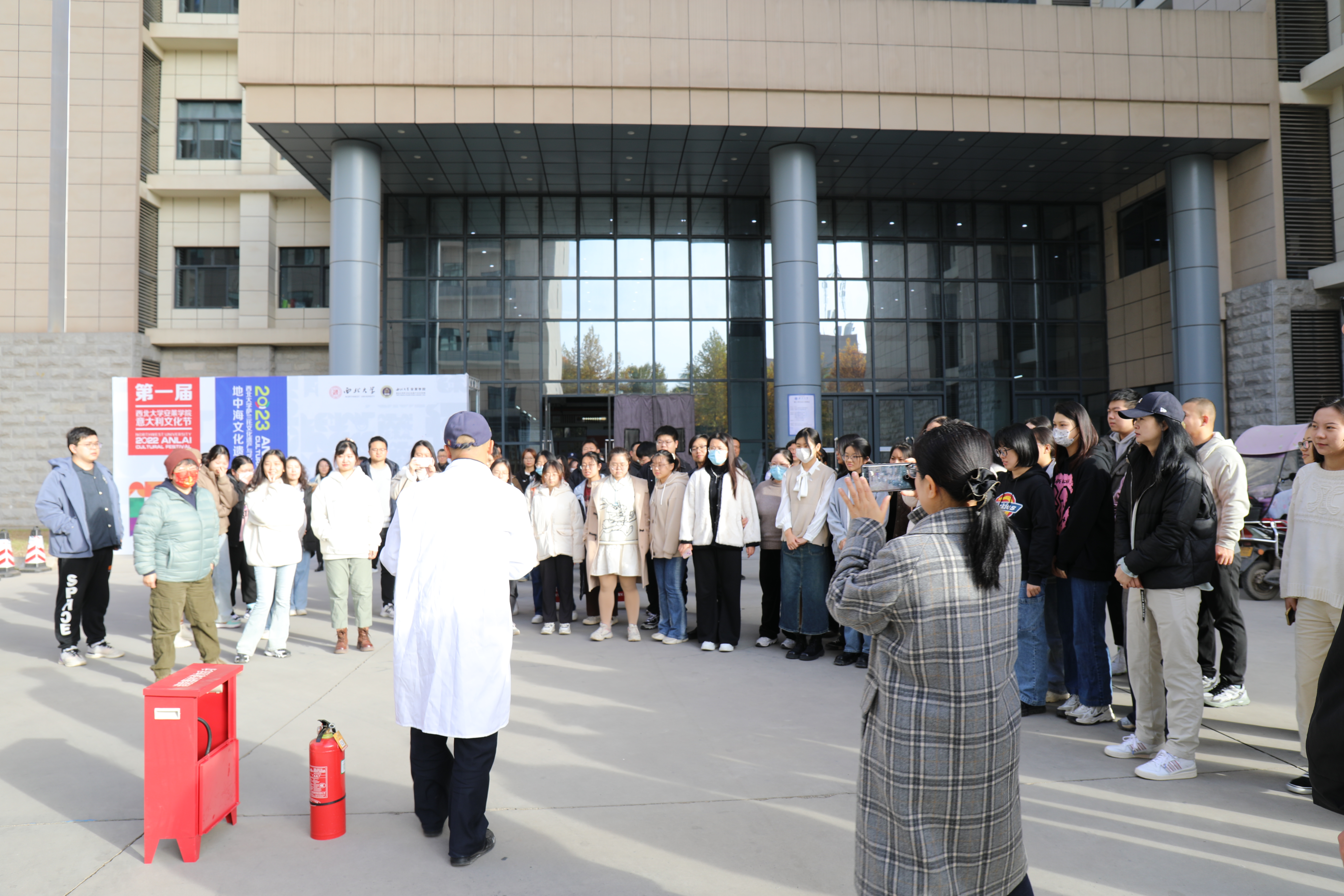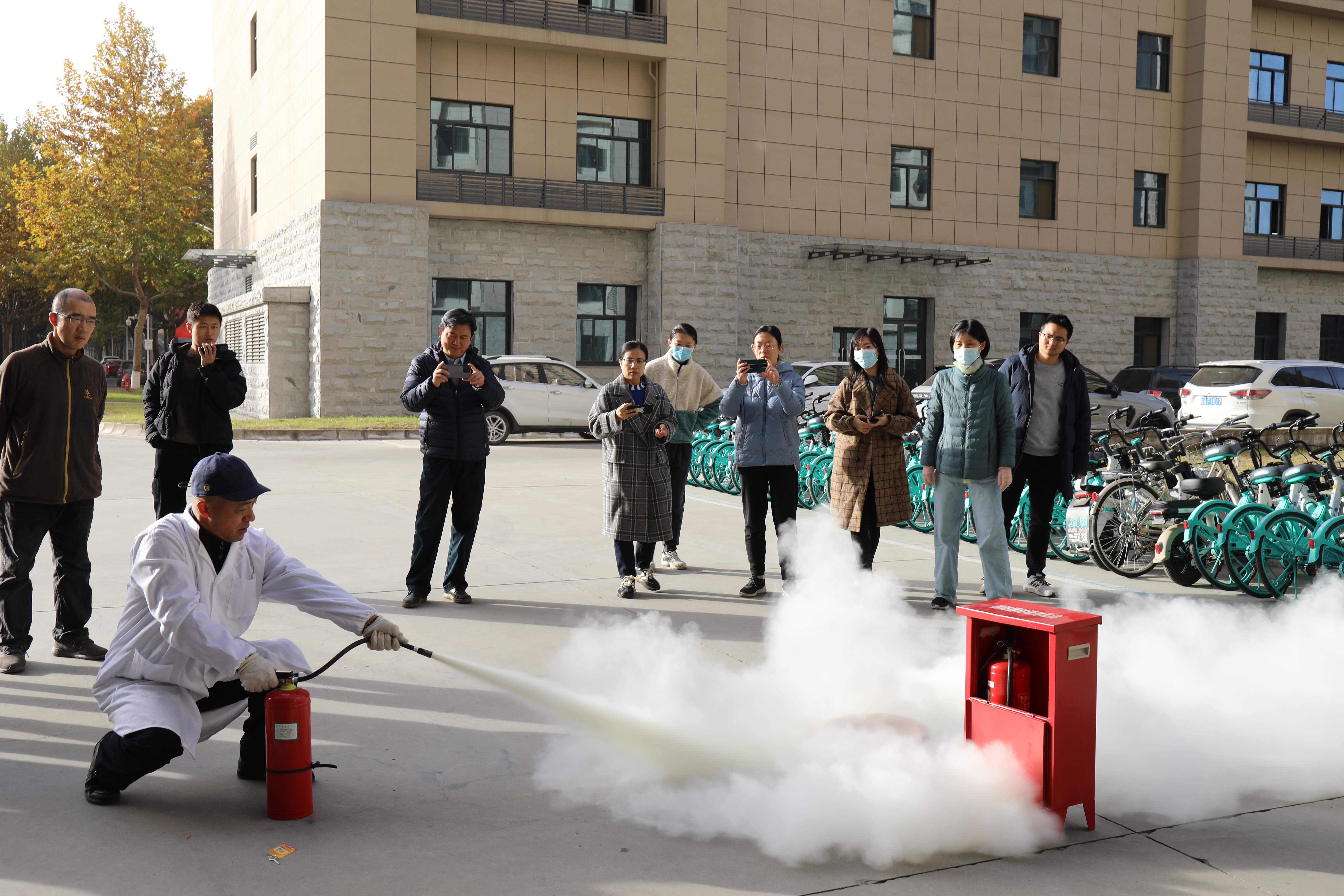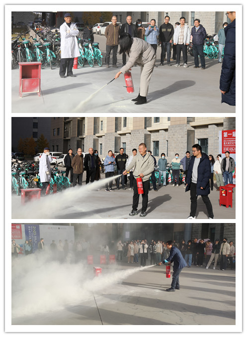 所有人员撤离到安全区域后,实验室安全员对消防器材的使用进行了现场教学,从灭火器的拿取、有效性判断、使用注意事项等方面进行了讲解与演示。之后,大家迅速动员起来,手执灭火器,进行灭火操作体验。